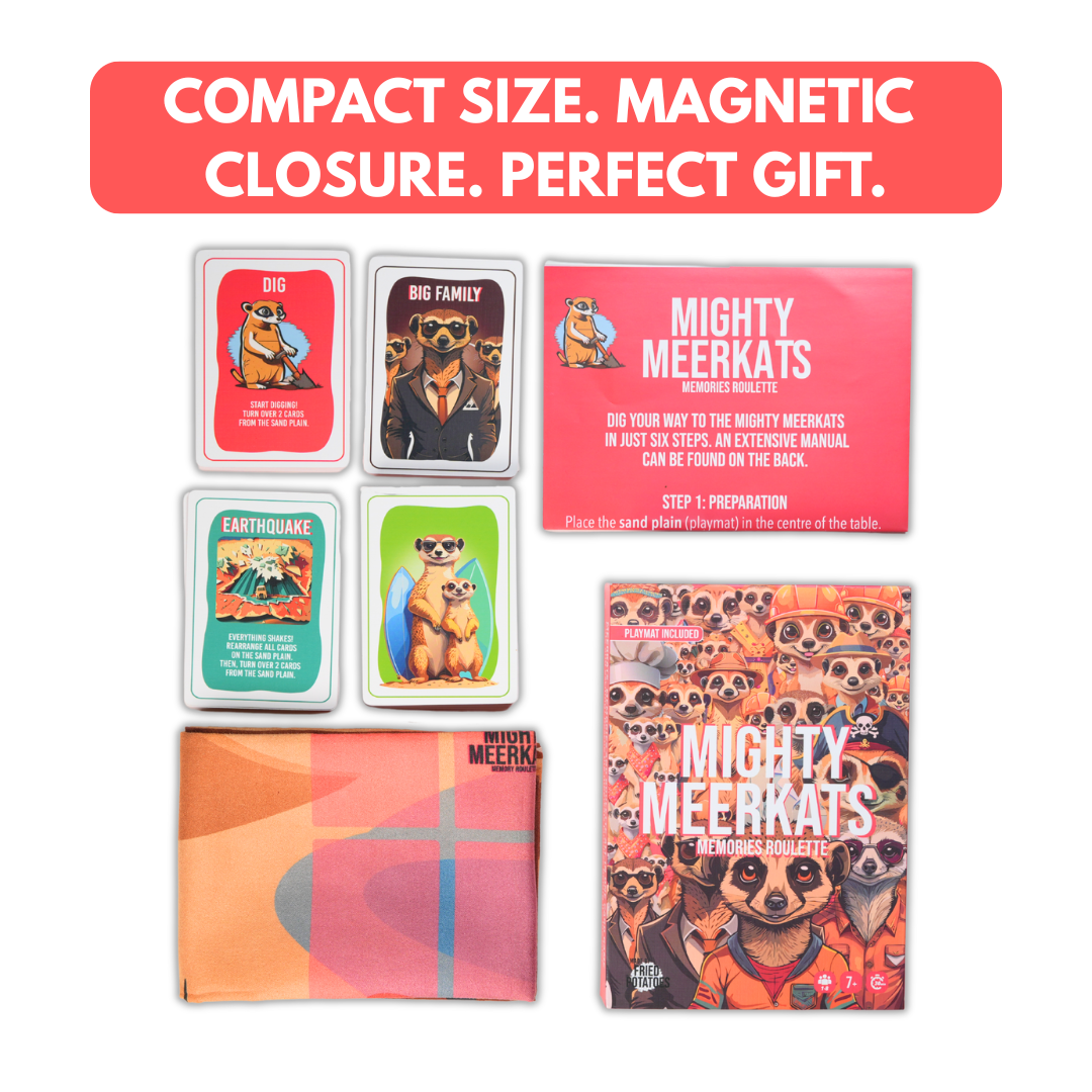 Mighty Meerkats: Memory Roulette is a super fun card game for everyone who loves these brave little desert diggers. The heroic meerkats are trapped beneath the sand. Can you dig them up and reunite their families before it’s too late?